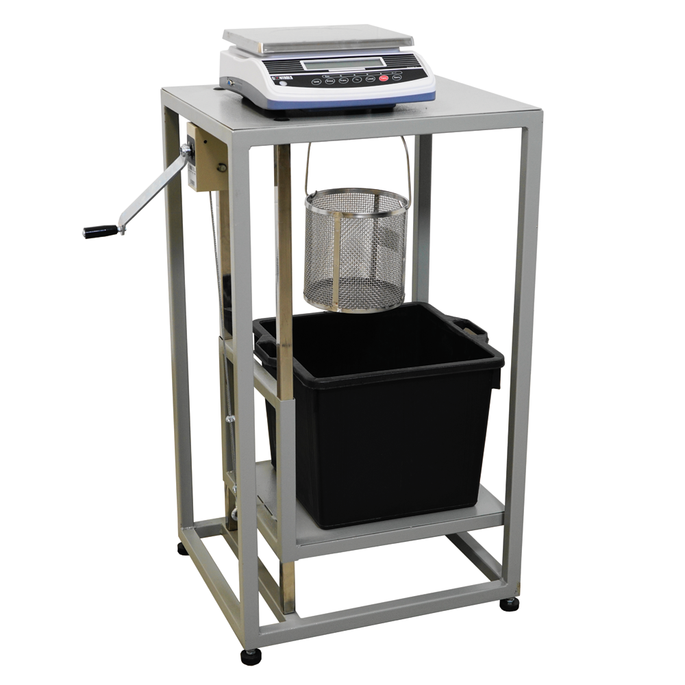 La parte inferior de ambos marcos incluye una plataforma móvil que sostiene el recipiente de agua de plástico o baño de agua, lo que permite pesar las muestras de prueba tanto en aire como en agua.