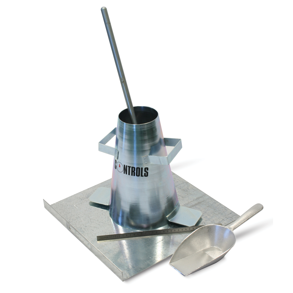 El Juego de ensayo de cono de asentamiento incluye un cono de acero protegido contra la corrosión, placa base, varilla de acero para apisonar, regla de acero y pala. Conforme a las normas EN y ASTM