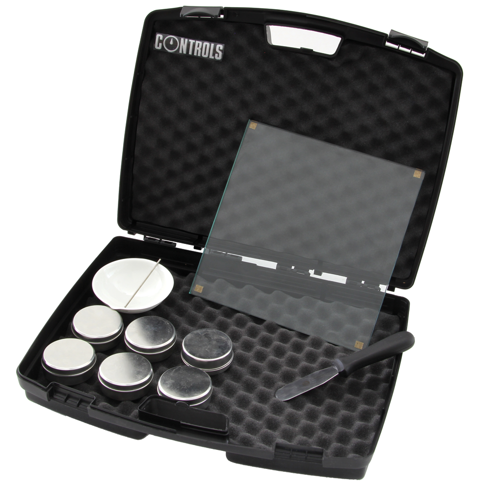 Juego de límite de plástico que incluye: – placa de vidrio de 300 x 300 mm – varilla de acero inoxidable de 3 mm de diámetro – plato de mezcla de 120 mm de diámetro – espátula flexible – 6 latas de contenido de humedad de 75 x 30 mm de diámetro Todo contenido en un maletín de plástico para transporte.